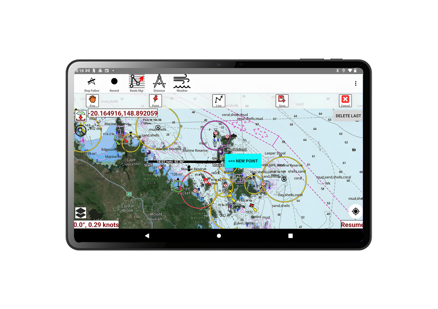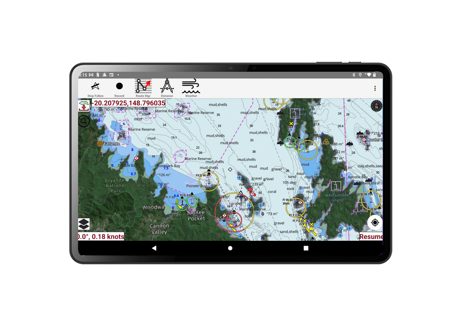 Select start and finish with central map cursor and course and distance will be displayed, alternatively from the drop down menu you can select ‘Auto route’ Select start and destination, safe depth and route will appear allowing for avoidance of all hazards and channel navigation marks where applicable