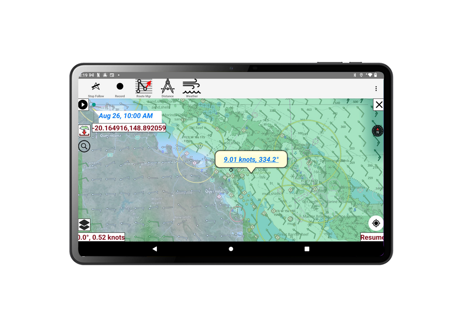 - ‘Stop/follow’ Click when moving, course and direction displays and course and speed appears at bottom left of screen