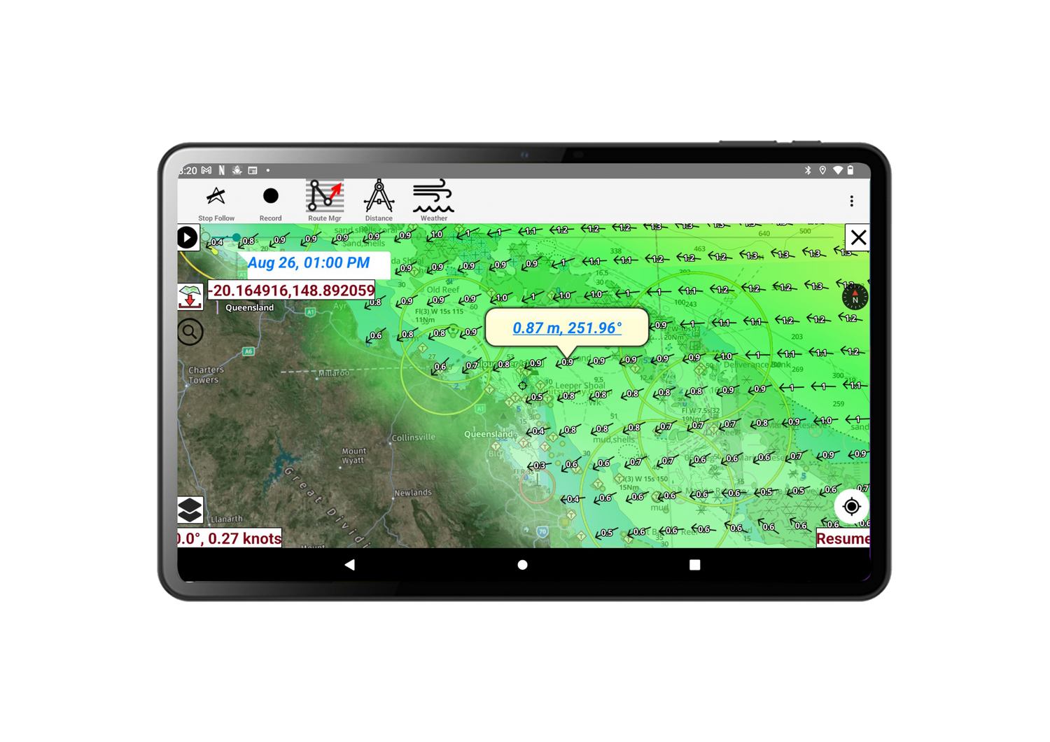 Note at the top of the screen a slide indicator will move 3 hourly and forcast wind for up to 3 days