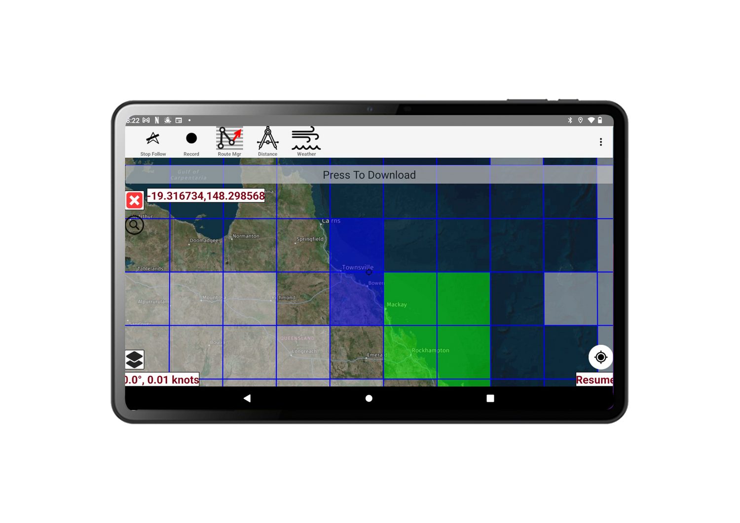 On the screen select the RED arrow to display chart squares, green are already downloaded, select up to 6 blue squares to download together. This is quite a quick process and should only take a 10-15 minutes to download all country charts for offline operations
